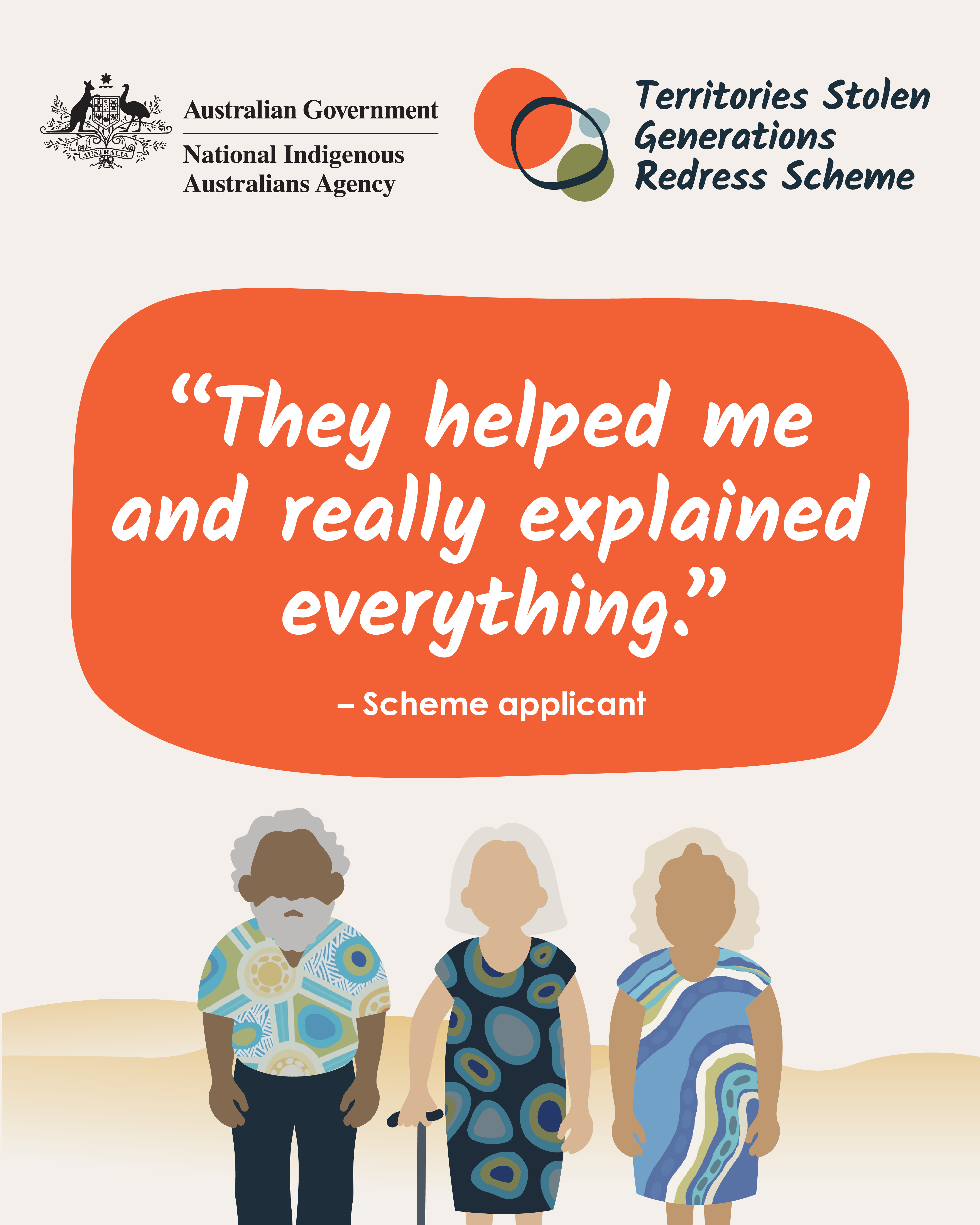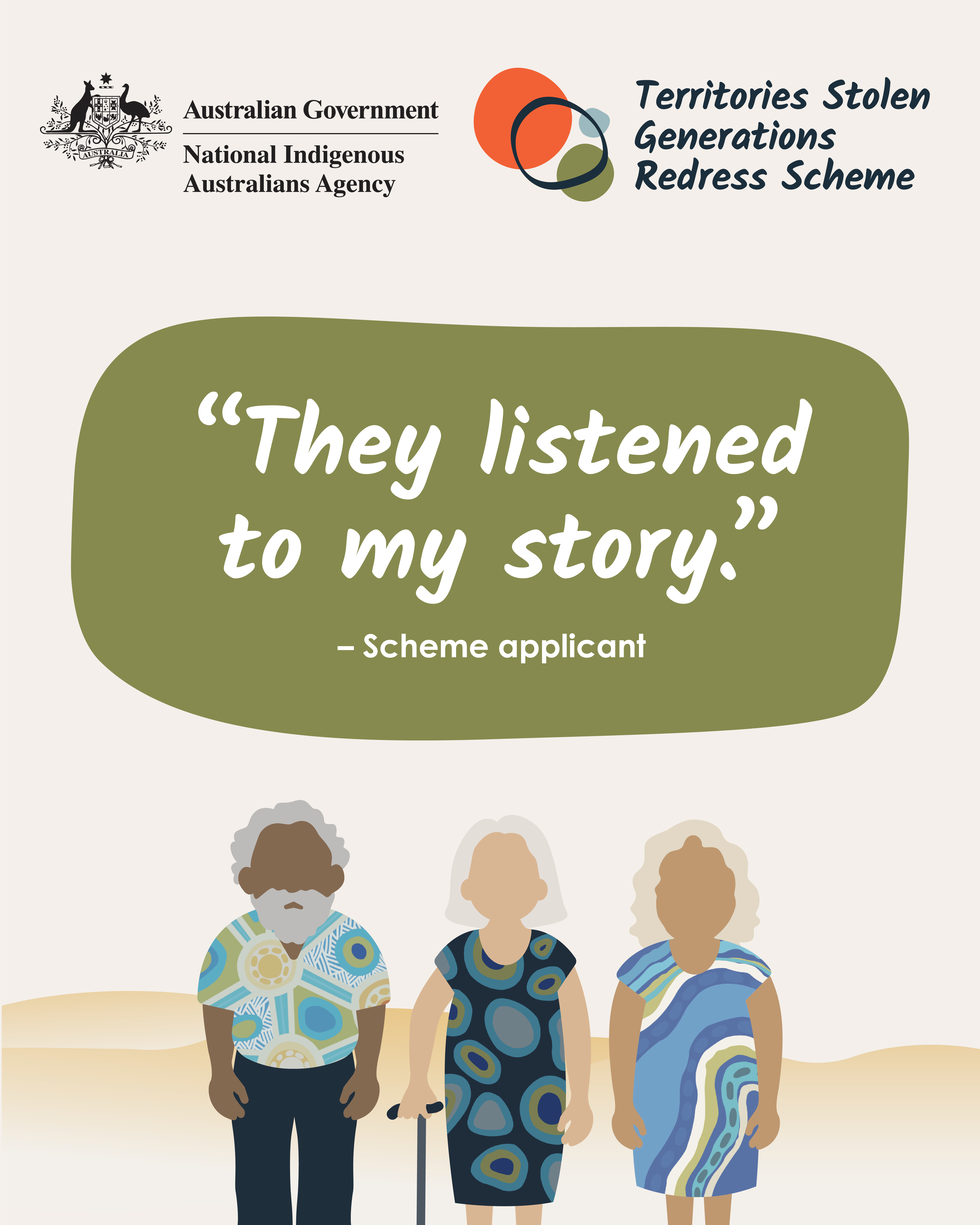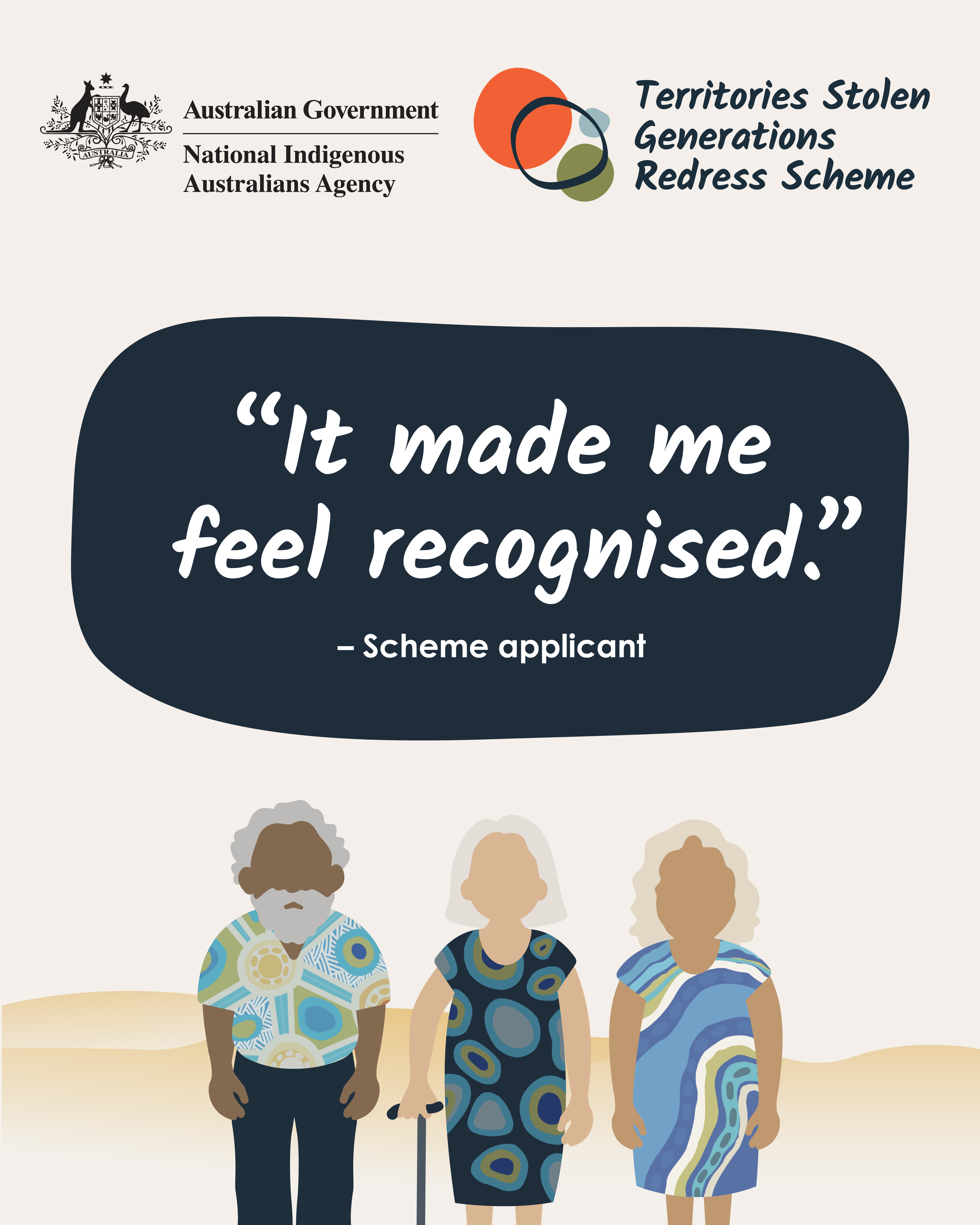 "It gives you back your identity" 1080x1350 Image "They helped me and really explained everything" 1080x1350 Image "They listened to my story" 1080x1350 Image "It made me feel recognised" 1080x1350 Image "Territories Stolen Generations Redress Scheme" - 1024x512